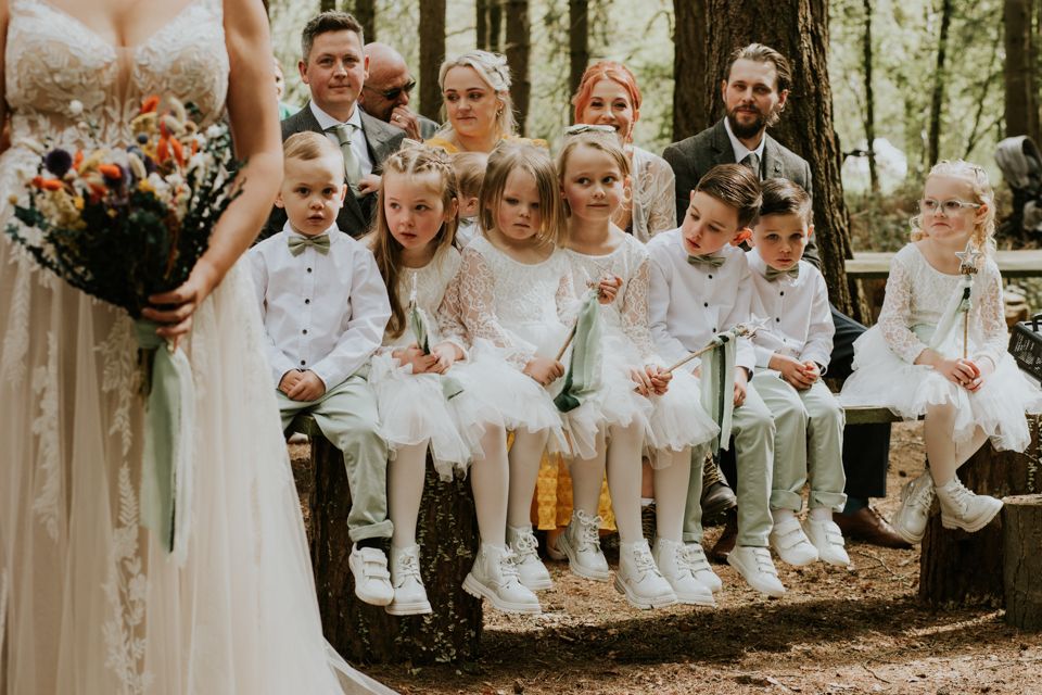 A wedding weekend at Camp Katur near York. Forest ceremony, glamping with friends, a bonfire the night before, and pizza in a wildflower-filled barn.