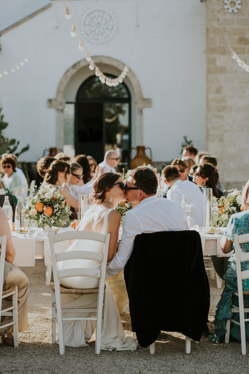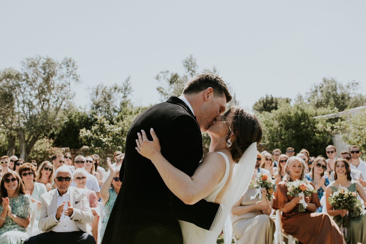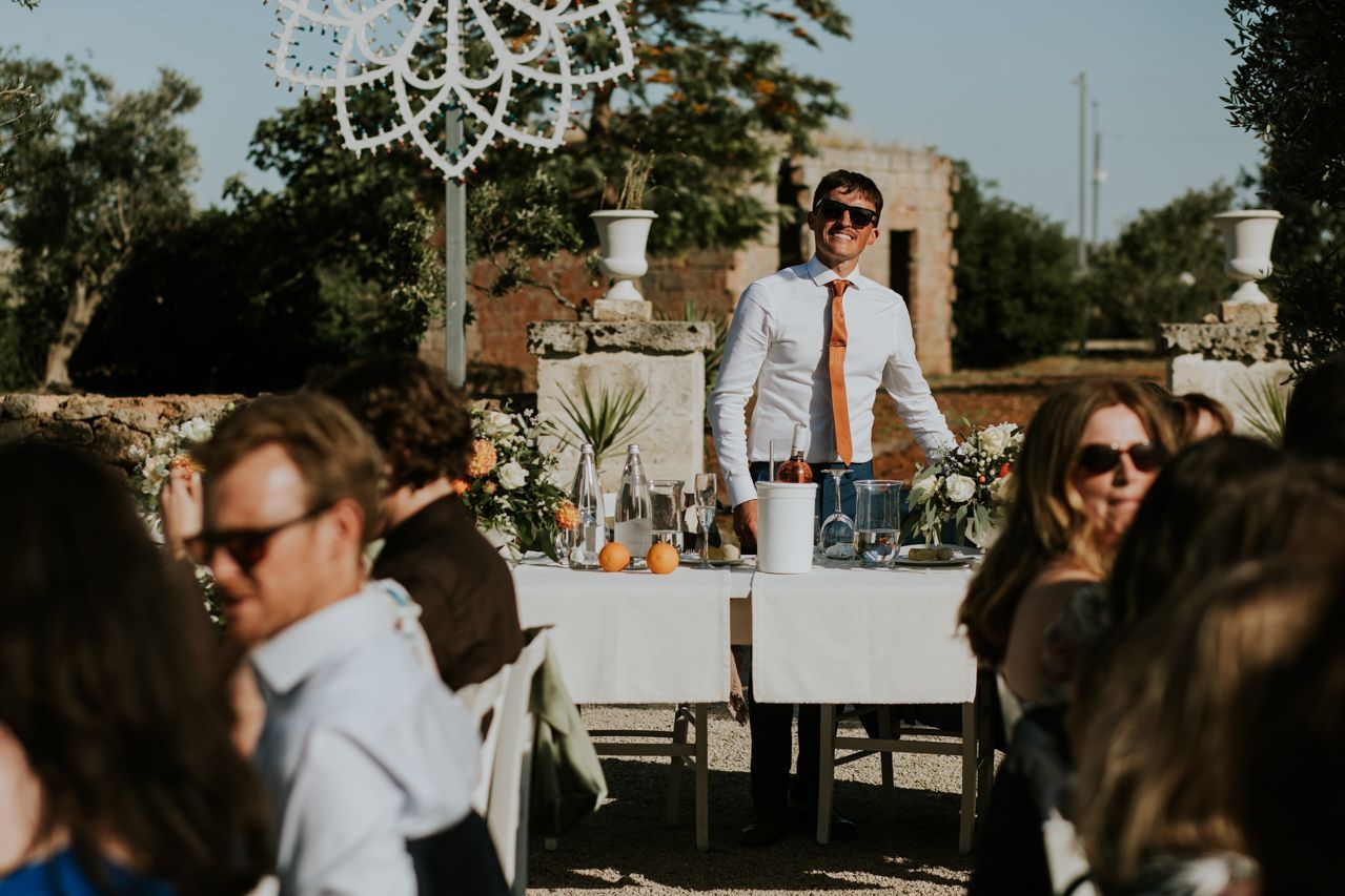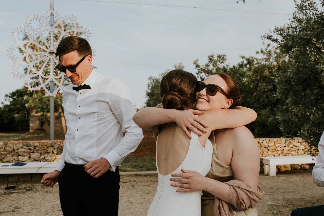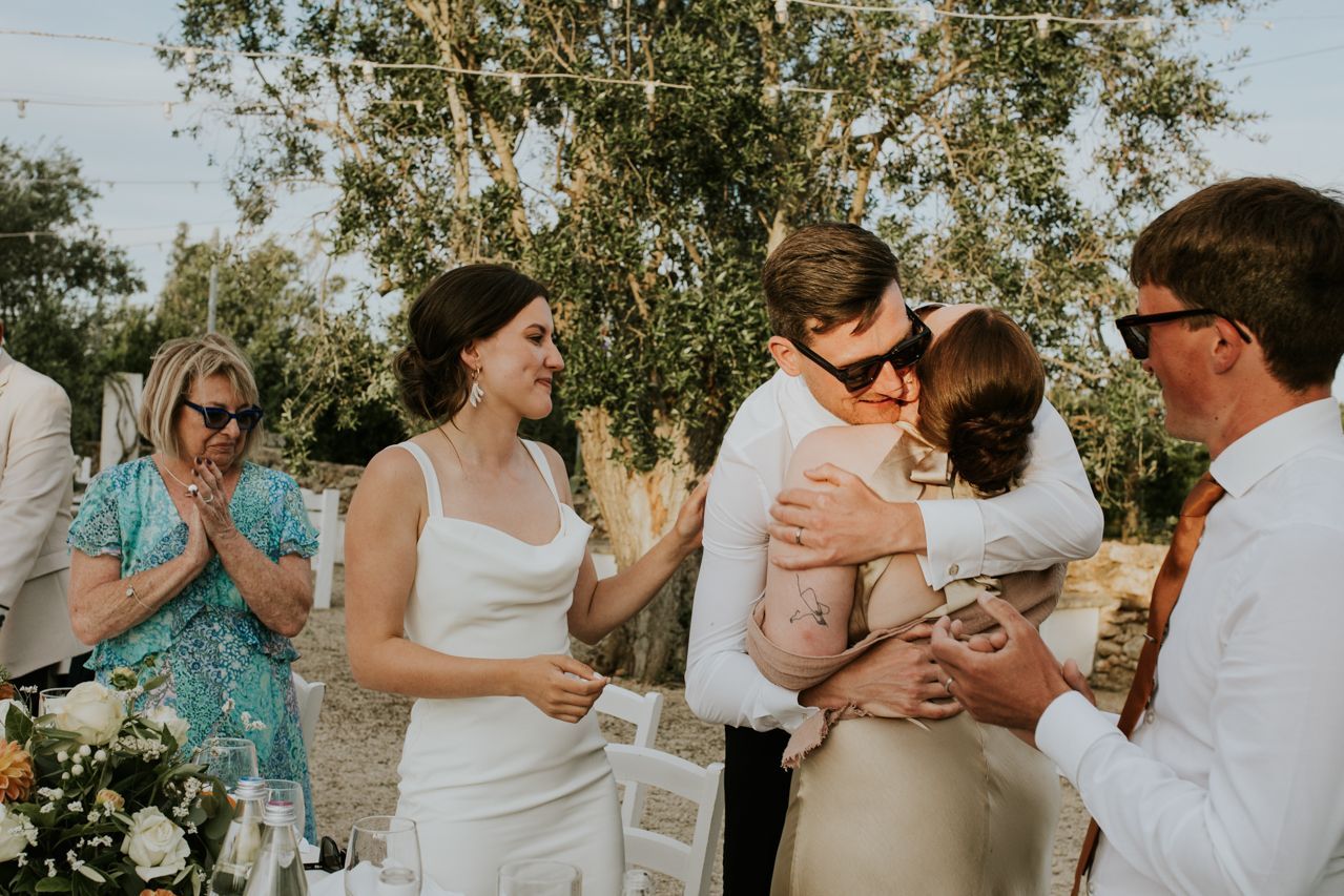 On the wedding morning, things were super chilled, with preparations happening around the masseria at a nice gentle pace. Doors open, music playing, friends popping in and out. There was no pressure, stress or rushing around . The ceremony took place outdoors among the olive trees, simple and personal, with beautiful light and lots of emotion. It felt intimate and honest, and typically Italian..